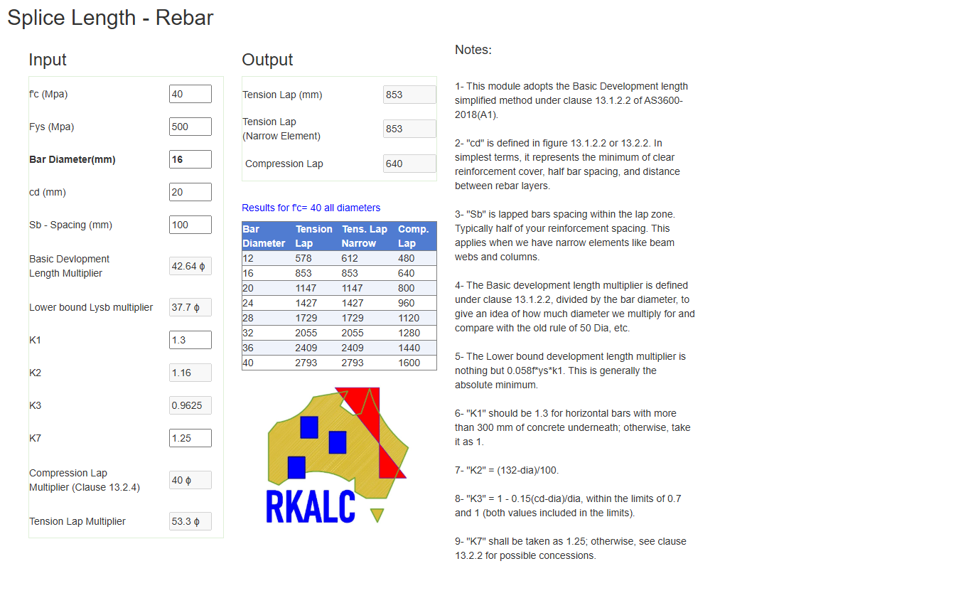 Simple tool to calculate development and splice length for rebar to AS3600-2018